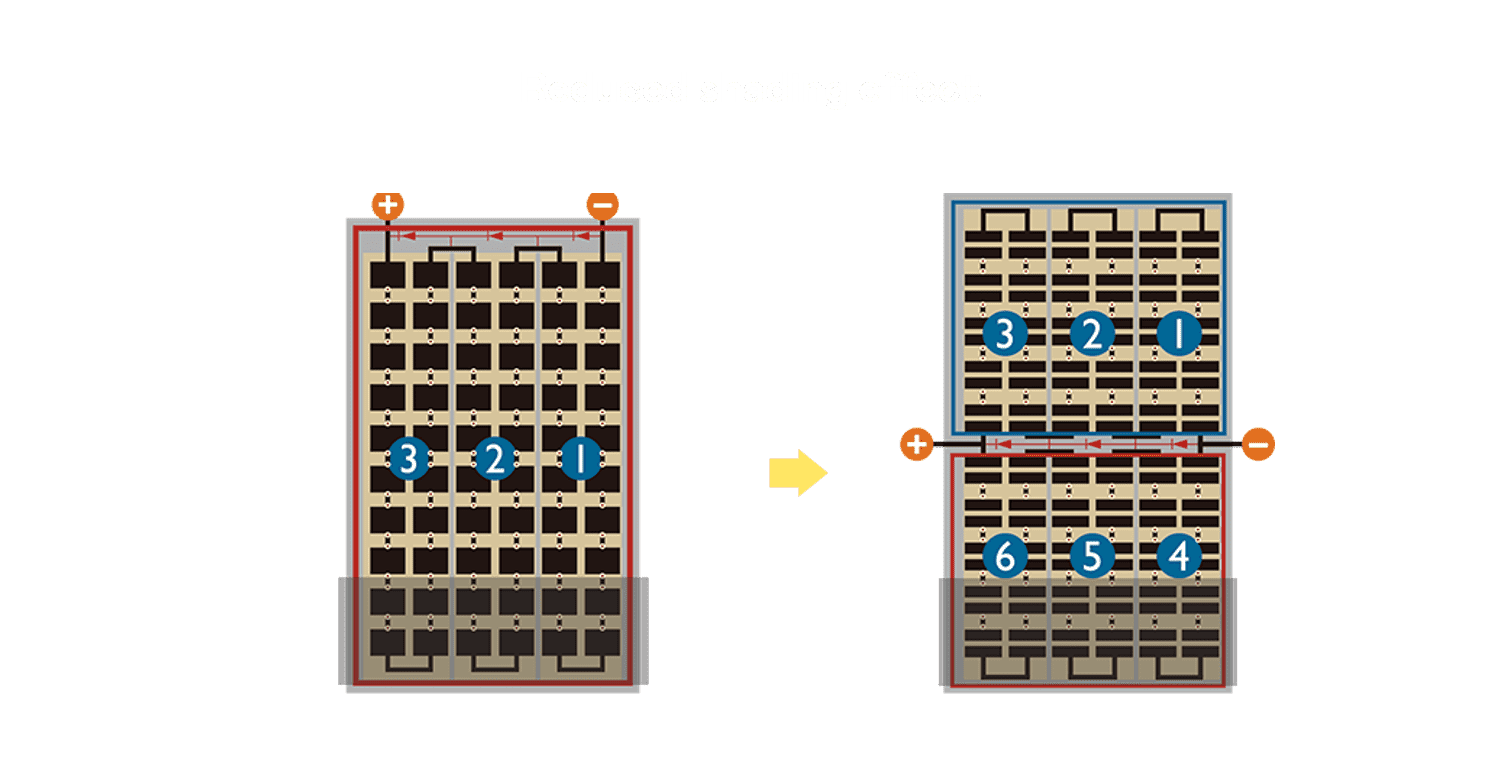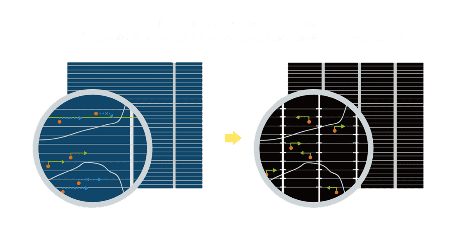 - 电池使用多条铜导线 (Copper wire) 于电池片上形成较短的电流路径,,,提高电流收集效率,,采用圆形设计的铜导线较传统扁平式的铜焊带 (Ribbon),,,可增加入射至电池的光线量。。。