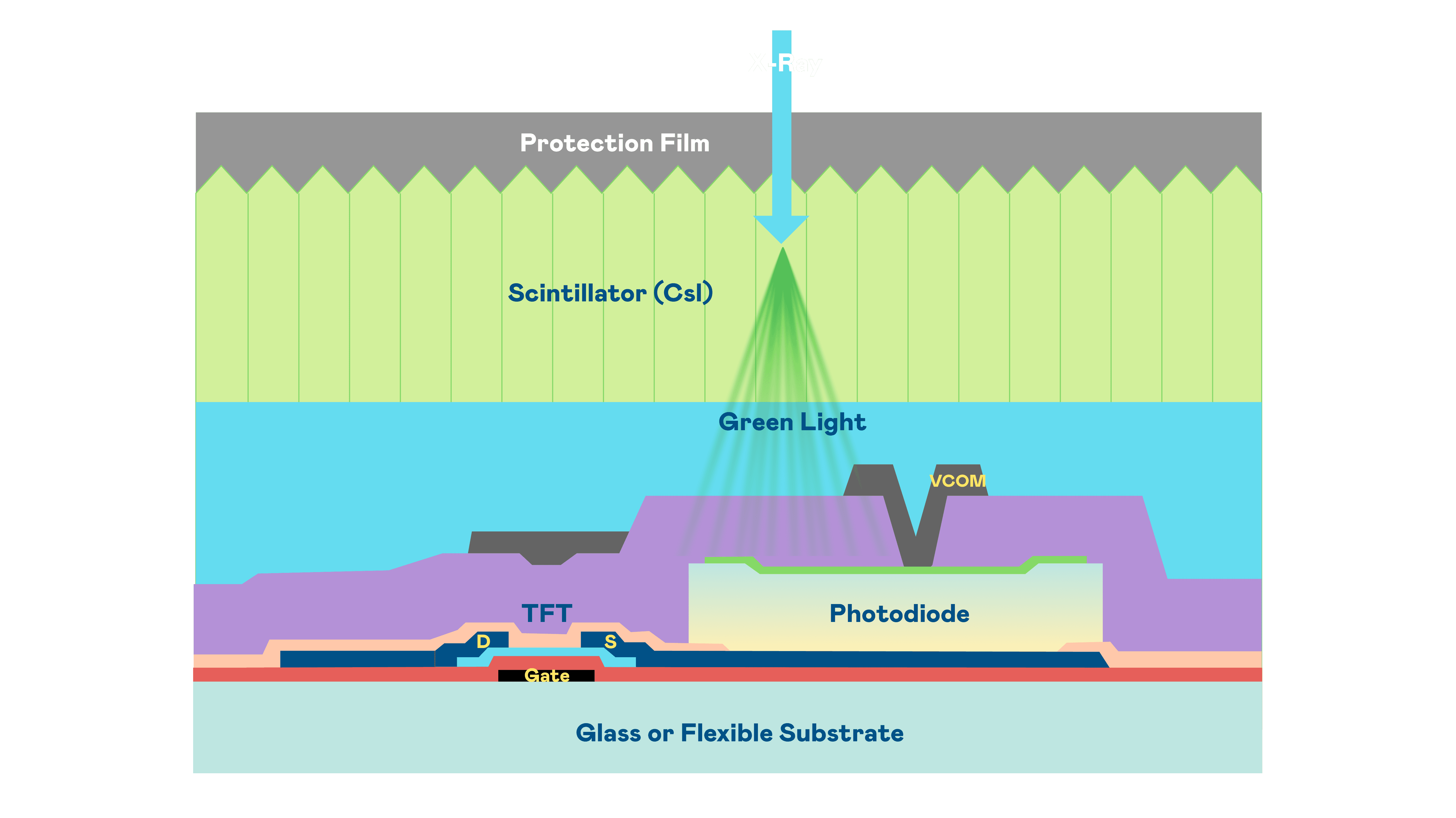 龙门国际的X光影像感测阵列使用薄膜电晶体 (TFT) 作为每个像素的读取开关,,,,搭配光电二极体(Photodiode)的光电转换元件,,,,用以感测X光影像讯号。。。